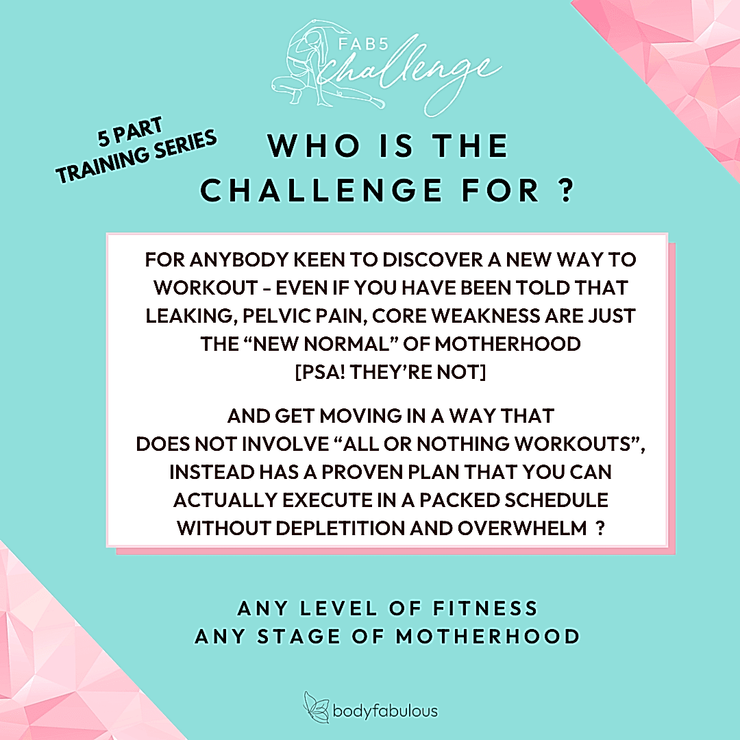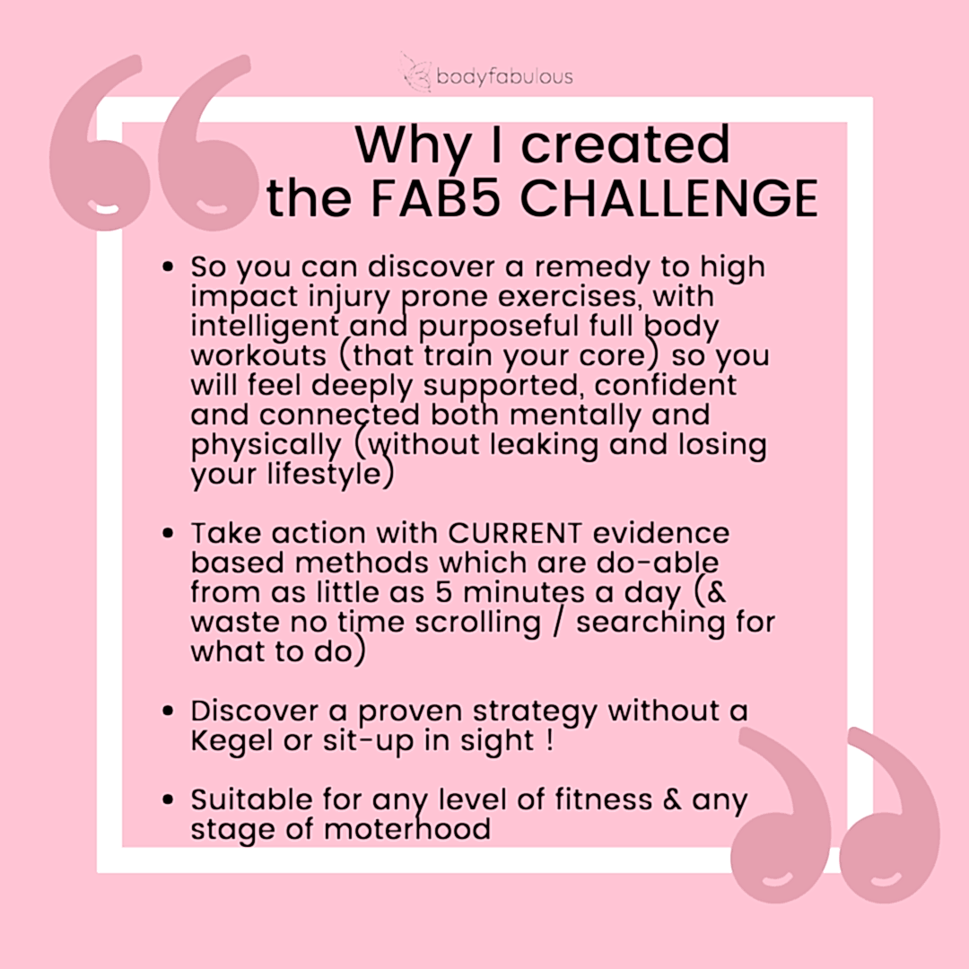 TAKE ACTION TODAY and commit to the FAB5 CHALLENGE, you will dive directly into my essential CORE FOUNDATION strategy (without a Kegel, or sit-up in sight) that regardless if you are a fitness fanatic or first timer, will get you moving with more connection, confidence and energy throughout any stage of motherhood !